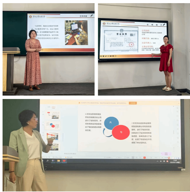 刘海燕、陈曦芃、李美娟、刘烨昭、万月、张泽帅六位老师做了赴企业挂职锻炼汇报。刘海燕老师结合自己担任财税顾问的挂职经历,提出教师接触真实企业财务等资料,有利于提高教师专业技能及实践能力,丰富课堂案例,更好的提升教学效果。陈曦芃老师提出通过与企业一线财务人员交流,找出解决方法,为完善课程内容提供有效的依据。万月老师提出企业实账和课堂教学有巨大的区别,从审核、记账到报表、报税,无论是纸质化、电算化还是智能财务,课堂与实际还有差别,也为此后课堂教学积累了实战经验。刘烨昭老师提到通过挂职锻炼更新行业信息,很好的提升自己的教学能力。李美娟与张泽帅老师分享自己的挂职看法,都提到挂职锻炼在帮助自己将理论知识得以更好应用,进而丰富课程内容,提高自己解决问题的能力。