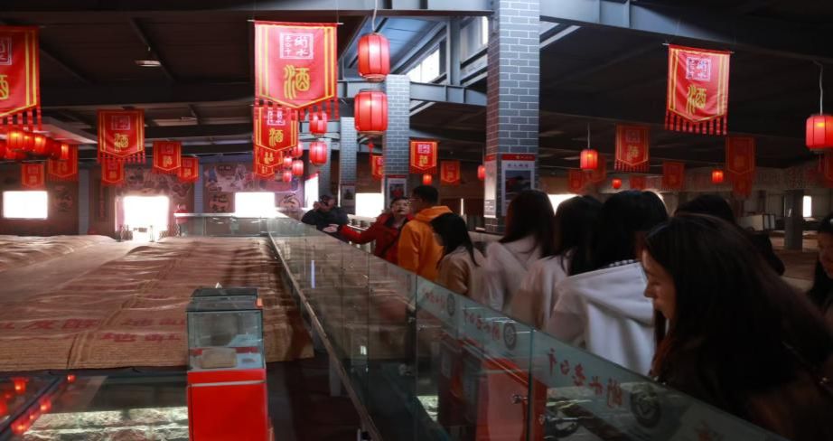 随后走进中国白酒地缸发酵博物馆,这里不仅是技艺展示的空间,更是一部“可以喝的历史”。同学们深入了解了地缸发酵对酒体纯净度的保障作用,并通过新旧酒品鉴环节,亲身体验新酒的浓烈与陈酒的醇厚之间的鲜明对比。在讲解员的引导下,大家逐步学会从色、香、味、格多个维度品读白酒,深刻认识到品质积累对品牌资产构建的基础性作用。