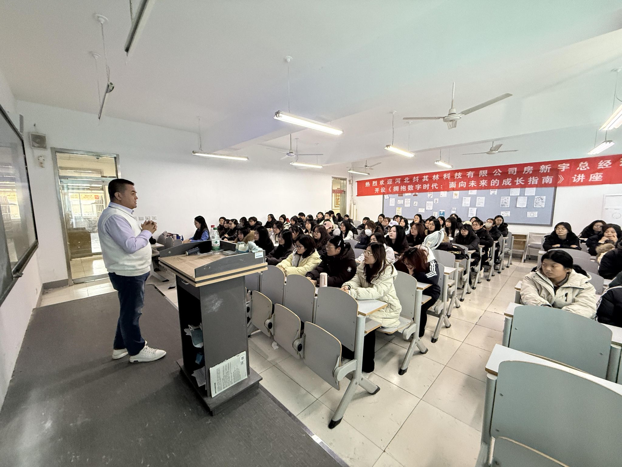 为帮助市场营销专业新生把握数字化浪潮下的行业动向,明确学习目标与职业路径,2025年12月5日,河北抖其林科技有限公司总经理房新宇受邀来到太阳成集团tyc33455ccww,在次教108教室为2025级市场营销专业学生带来题为《拥抱数字时代,面向未来的成长指南》的专题讲座。