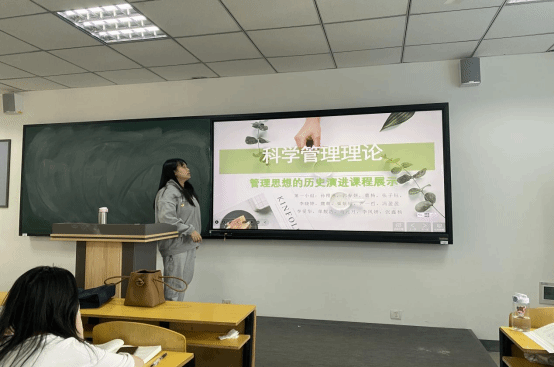 在部分章节的教学中,该课程采取了参与式教学、学生团队化学习等教学方法,使学生被动接受转变为主动学习,在轻松、愉快的课程教学与交流中感悟管理。本次课程涉及了《管理学》中理论性较强的一章内容,即管理理论的历史演变。杨文婧老师在学习通平台提前布置了学习任务,由学生分小组查阅资料理解主要理论,通过对资料进行分析、归纳、整理,制作成演讲PPT。课上小组代表上台讲解,讲解完毕由其他小组成员进行点评,教师再进行总体评价。通过改革教学方式,让每位学生都参与到对理论的自主学习中,让学生在了解教材有限的内容基础上对理论背后的人物、背景有了更深入的理解,也使学生有了更深刻学习的体会。