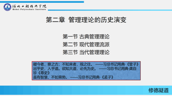 本课程主要引用习近平总书记学习用典中的经典名句,用中国经典讲“中国经验”,以中国道理说“中国道路”。这些典故名句是5000年文化长河中沉淀的智慧结晶,寓意深邃、生动传神,极具启迪意义,也彰显了文化自信。这堂课杨文婧老师在授课中引用了“疑今者,察之古;不知来者,视之往”、“出乎史,入乎道。欲知大道,必先为史”、“虽有智慧,不如乘势” 等经典名句,引导学生要胸怀中华民族伟大复兴战略全局和世界百年未有之大变局,树立大历史观,从历史长河、时代大潮、全球风云中分析演变机理、探究历史规律,提出因应的战略策略,增强工作的系统性、预见性、创造性。国学经典思政元素的融入,可赋予枯燥的管理学理论以新活力、新内涵,在传授管理知识之余,让学生领略国学经典的智慧与魅力,培养学生民族的自豪感和自信心。