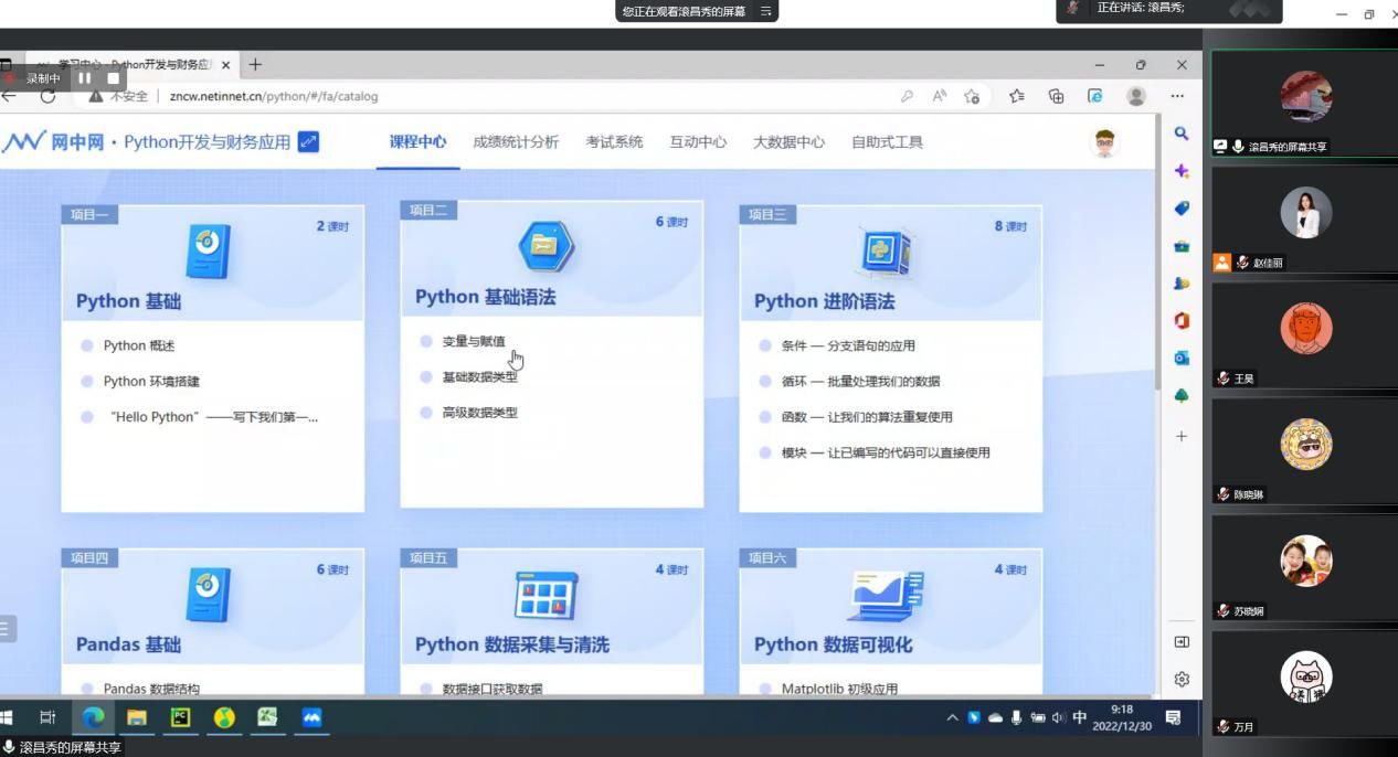 “Python财务开发与应用”课程模块基于网中网Python开发与财务应用平台 ,指导参训教师学习Python基础语法、常见语句与数据类型、数据采集及清洗等常见内容,并通过综合案例示范教学、课程教学讨论等形式,夯实参训教师们的学习成果。