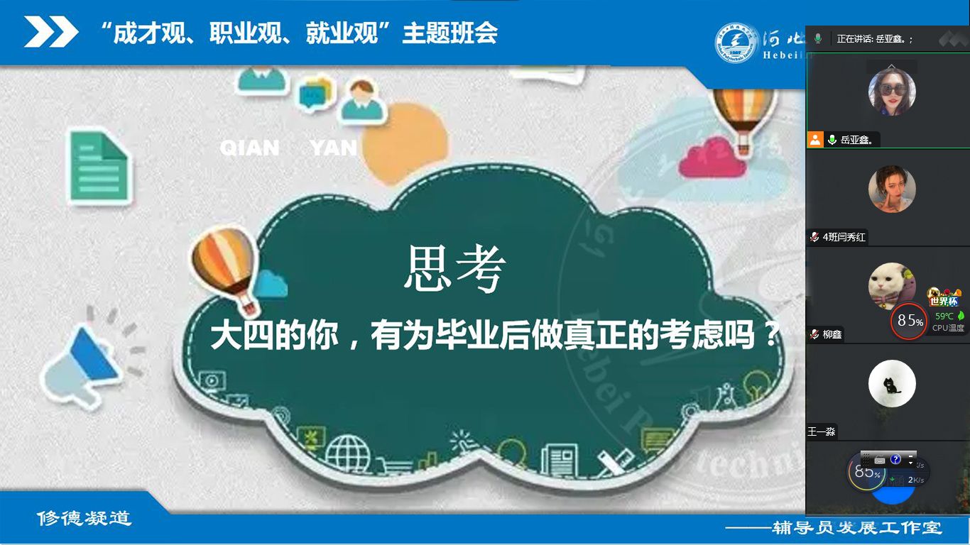 太阳成集团各毕业班以线上形式召开了2023届毕业生就业动员“成才观、职业观、就业观”主题班会。帮助毕业生能够更好的认清就业形势,做好就业准备,把握就业机会,优质积极就业。