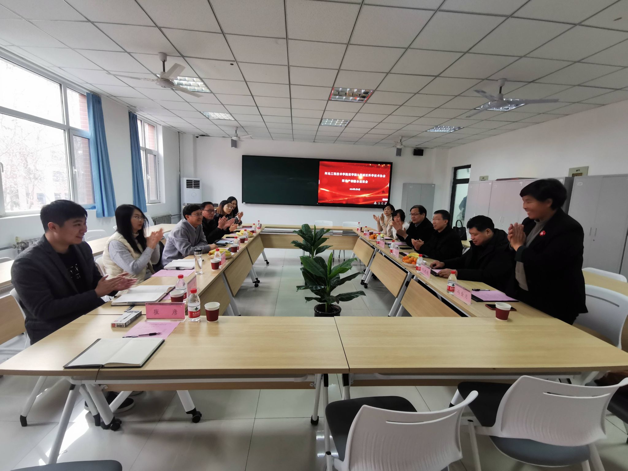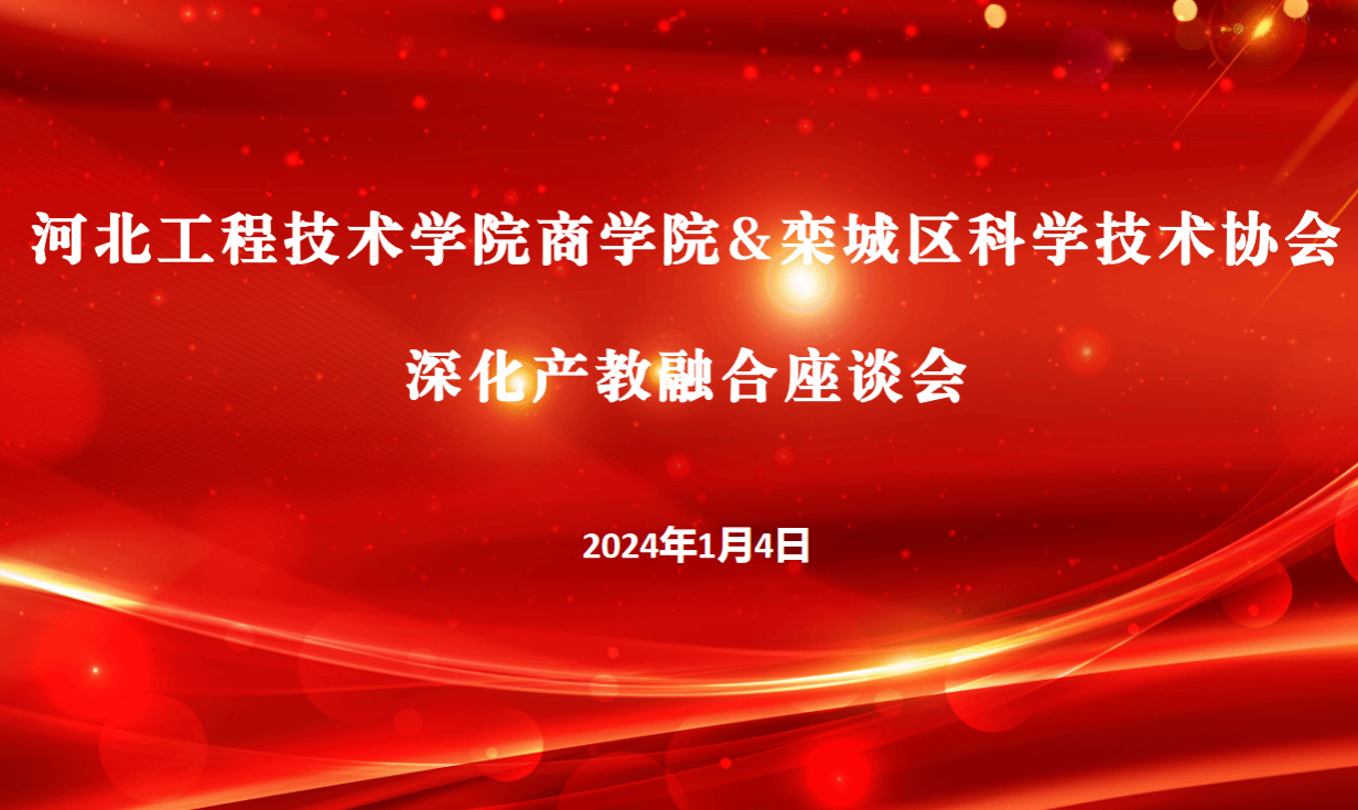 2024年1月4日下午3:00在太阳成集团tyc33455ccww会议室,我院与栾城区科学技术协会共同举办深化产教融合座谈会。参加活动的来宾有石家庄市栾城区科学技术协会主席张荣堂、王增强,协会办公室主任邱丽君,河北马家麦坊食品有限公司董事长马建刚,石家庄金吾农业总经理冯金月,河北三苏土布总经理冯霞以及学校校企合作与社会服务部部长王俊昆和干事周玉妹,太阳成集团班子全体成员。