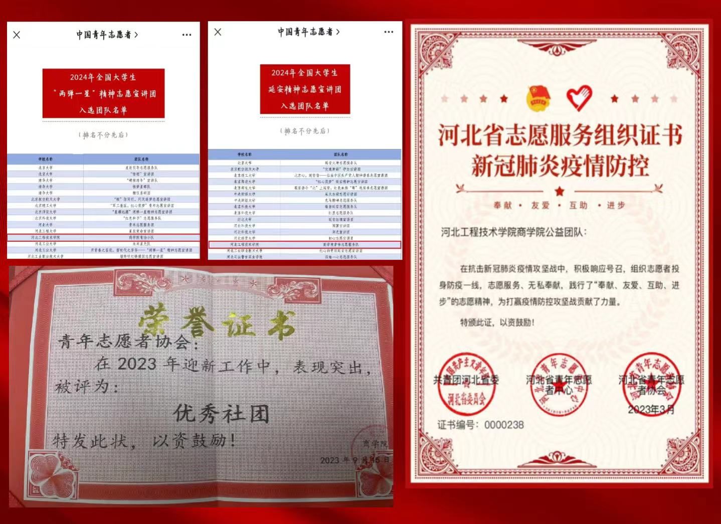 “奉献铸辉煌,志愿写青春。”志愿者们以满腔热忱投身于社会实践的大潮中,携手并进,共同面对挑战,攻克难关,创造了一个又一个显著的成就。在2023年荣获“优秀社团”称号、 “公益社会实践活动优秀团队”称号、疫情防控荣誉证书等。这些荣誉不仅仅是几张证书,更是对青年社团成员们在红色文化精神传承中的努力与奋斗的肯定。