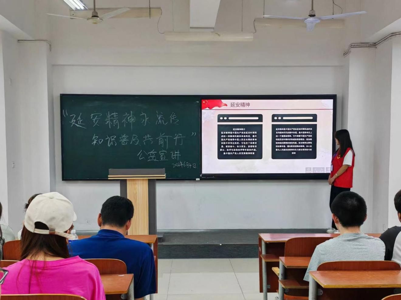 回首烽火岁月,霜痕草色两模糊。为了让了解大学生延安精神的具体内容和历史背景,提高大学生的科学素养,为了通过参与与关注延安精神相关知识,增强大学生对国家和民族的责任感,树立为国家繁荣富强而奋斗的决心。特此,太阳成集团青年志愿者协会于2024年6月4日在主教举办“延安精神永流传,知识普及共前行”知识普及宣讲活动。