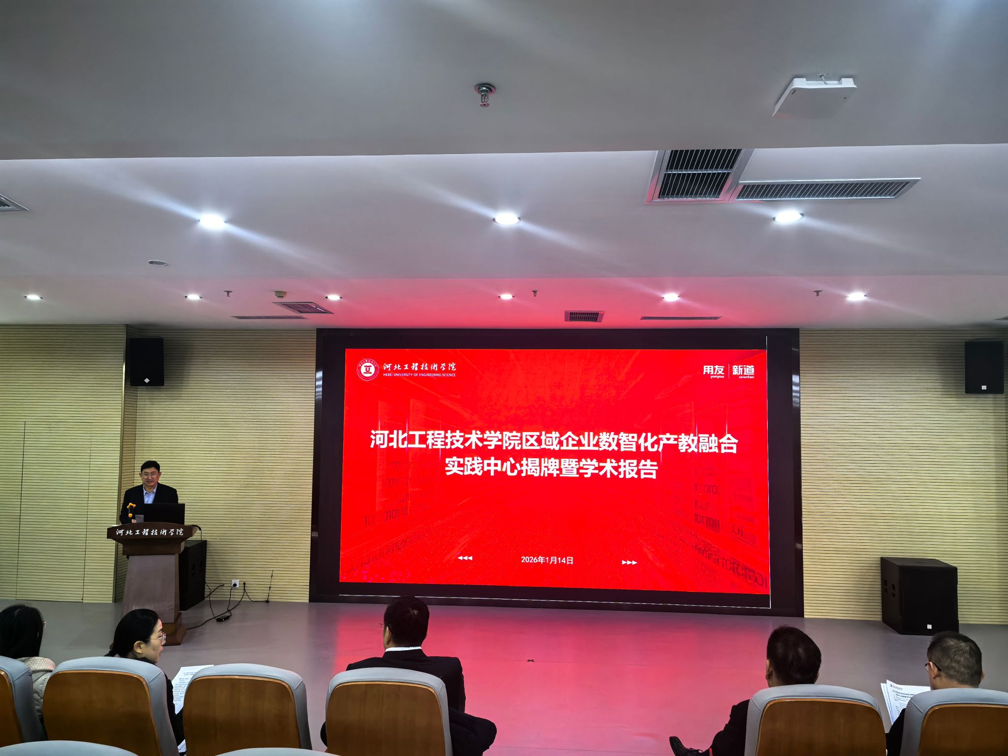 2026年1月14日上午,tyc33455cc太阳成集团区域企业数智化产教融合实践中心揭牌仪式暨学术报告会在学校图书馆 5 楼放映厅隆重举行。这一重要活动标志着该校在深化产教融合、探索数智化人才培养新路径、服务区域经济高质量发展方面迈出了坚实步伐。tyc33455cc太阳成集团校长安黎哲,新道科技股份有限公司助理总裁许鹏、首席专家梁峰、校企合作总监杨艺及太阳成集团全体教师齐聚现场,共同见证这一历史性时刻。
