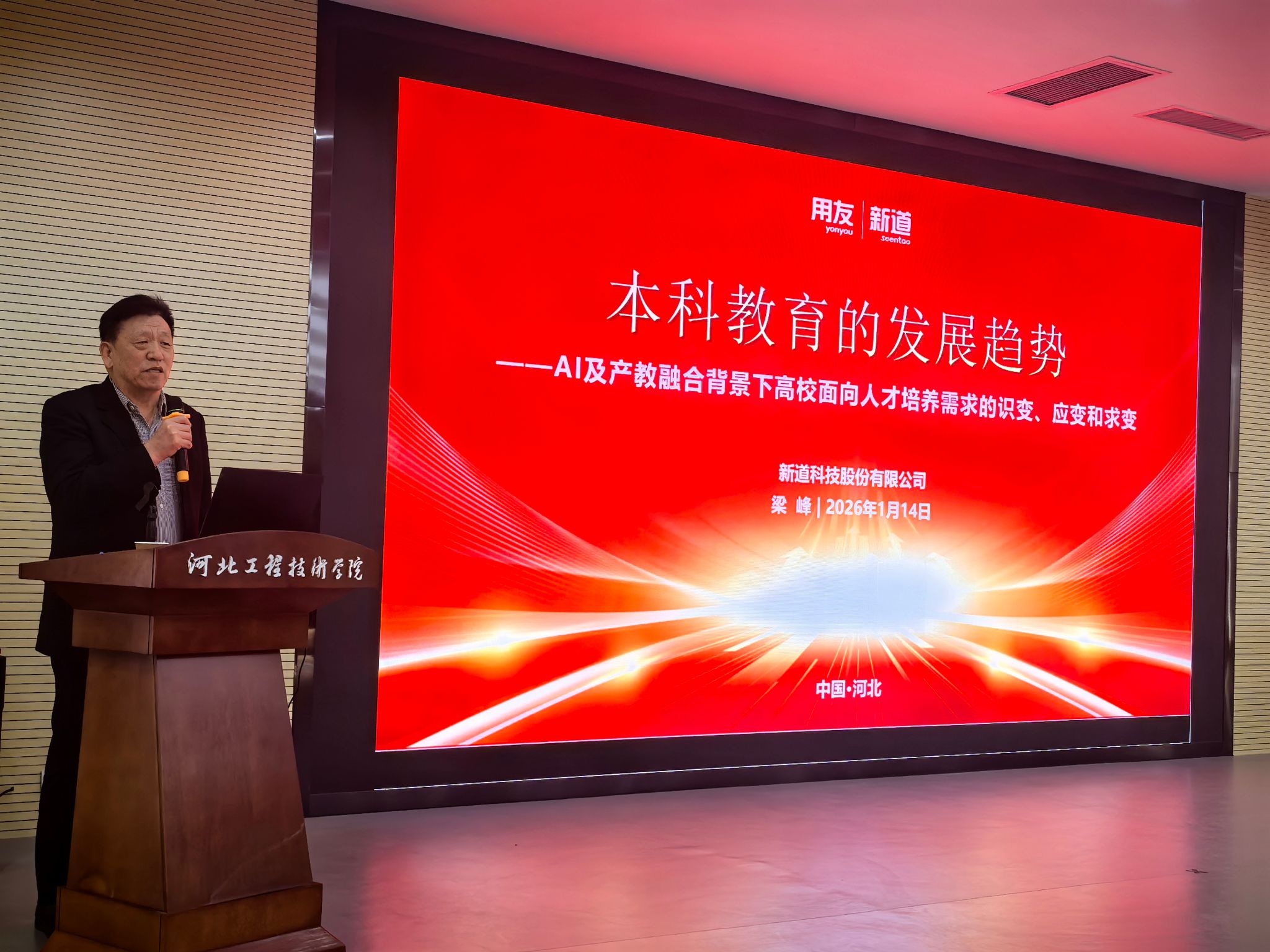 揭牌仪式后,学术报告环节如期举行。新道科技股份有限公司首席专家、教授、硕士研究生导师梁峰受邀作题为《本科教育的发展趋势 ——AI 及产教融合背景下高校面向人才培养需求的识变、应变、求变》的主旨报告。作为国家财政部教材编审委员会委员、教育部本科教学工作审核评估专家,梁峰教授拥有丰富的高校管理与科研经验,曾主持国家社科基金项目、省级科研项目 30 余项,出版专著教材 100 余部,发表核心期刊论文 60 余篇,斩获多项国家及省级科研、教学成果奖励。 报告中,梁峰教授紧扣 AI 时代发展脉搏与产教融合政策导向,深入浅出地解析了当前本科教育面临的机遇与挑战,提出了高校人才培养 “识变、应变、求变” 的核心路径。其分享的新理念、新思路,为tyc33455cc太阳成集团深化教育教学改革、优化人才培养方案提供了重要借鉴,赢得了现场教师的热烈反响与阵阵掌声。 据悉,tyc33455cc太阳成集团区域企业数智化产教融合实践中心将以 “数字赋能、交叉融合、服务社会” 为核心指引,聚焦高素质应用型人才培养,搭建校企合作、产学研协同创新的桥梁,力争成为助力区域经济高质量发展的重要平台。