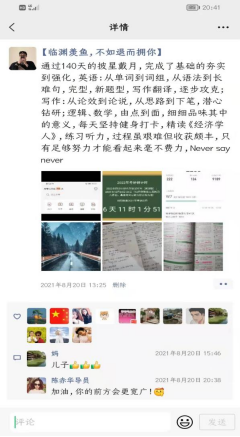 我是在21年4月份正式开始备考的,我开始的时间并不算早,我主要采取“自学+线上”的学习模式,我没有报线下的哪种辅导班,线下的辅导班最大的优势就是能够加强约束力,但是就目前的情况而言(疫情当下,封校),线下也就是网课,所以吧,优势也就不存在了,下面我给大家推荐一下我看的网课(只是个人观点),英语阅读我是学的唐迟老师的,唐迟的阅读方法我觉得还是比较高效的;完型,新题型我是听的有道的赵楠楠老师,翻译、写作我是听的奶哥的(陈曲);数学前期基础我学的是陈剑团队的朱曦老师,朱曦老师讲课比较基础,后期主要是张紫潮的技巧做题;逻辑是赵鑫全和薛睿,其实听课是一方面,主要是自己理解透老师讲的方法与精髓要点,我从4月到6月中下旬完成了一刷,6月中下旬到8月中下旬完成了强化,9月到11月完成了三刷,最后冲刺到12月25号,虽然时间是这样计划的但是有些事还是要提前做的,有些事情可能不是你所计划的那样的,我在备考期间考取了初级会计、教师资格证、驾驶证、英语四级,考过了党课成为预备党员等等,特别英语四六级是可以和考研一起备考的,这是一些学习上的小经验,我相信你们一定比我优秀,你们定会上岸,只有足够努力,才能看起来毫不费力,加油!