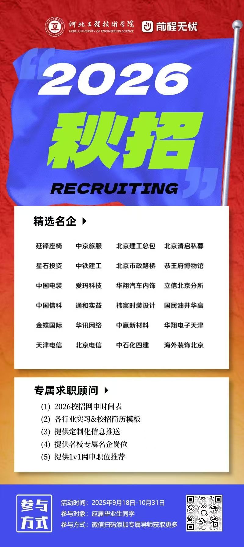 2026届的毕业生们,秋招季已经到来,你准备好了吗?本次招聘会汇聚延锋座椅、星石投资、中国电科、金蝶国际等众多知名企业,涵盖制造、金融、科技、文化等多个领域,为你提供丰富优质的就业机会!更有专属求职顾问为你提供网申时间表、简历模板、定制岗位推荐等一对一服务,助你精准锁定心仪职位。活动时间为2025年9月18日至10月31日,仅面向应届毕业生开放。微信扫码添加导师,获取更多资源,迈向职业人生的第一步——我们等你来!