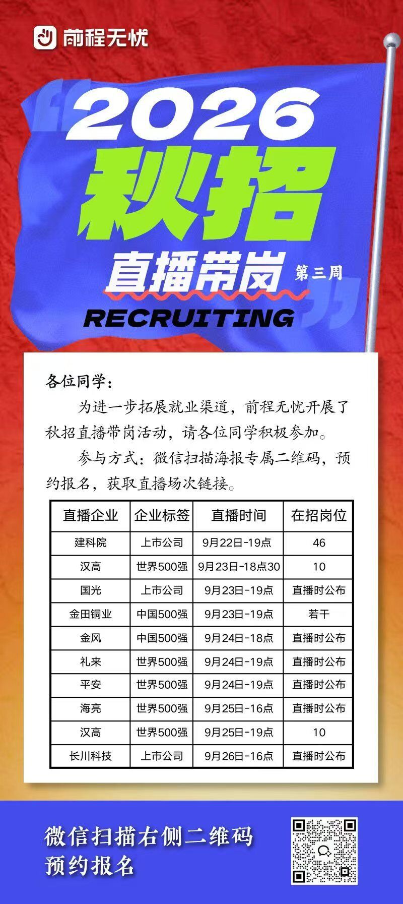秋招季已经到来,你是否正在寻找一个高质量的职业起点?为进一步拓展就业渠道,前程无忧现推出“直播带岗”(第三期),汇聚建科院、汉高、金风、平安、礼来等多家世界500强、中国500强和上市公司,涵盖众多优质岗位!只需微信扫描海报二维码,预约报名即可获取直播场次链接,与企业HR实时互动、直通面试机会。