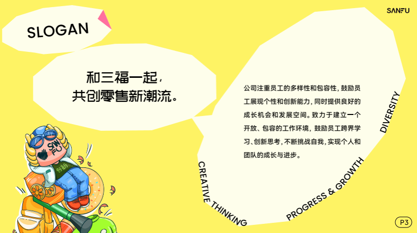 三福注重员工培养和激励,打造一个充满激情和创造力的团队,共同推动公司的发展。秉承诚信经营,履行社会责任,为年轻人的成长和进步作出积极的贡献。三福希望,每一个年轻人在这里都能找到属于自己的潮流生活。