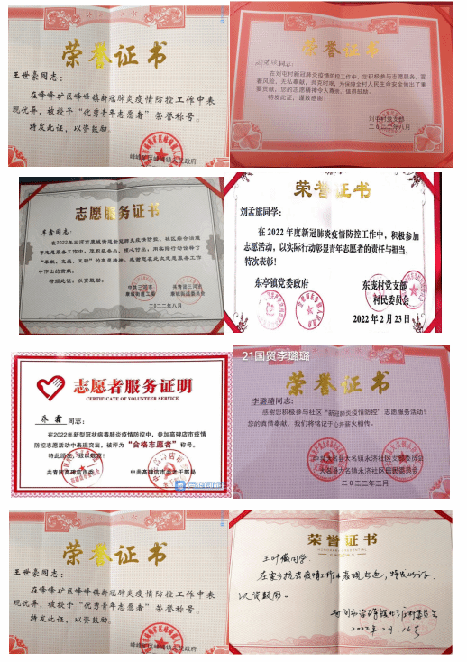 于校外,同学活跃在各市县的志愿实践岗位中,不论是疫情期间的社区、村委志愿者,亦或者是团体对家乡的实践调研,再或者是个人的三下乡。同学抓住每一个为群众、为社会、为国家奉献自己的机会,将自己的价值充分在实践中展现出来。他们有的作为团员、有的作为积极分子或者预备党员,都有着坚定的理想信念,切实地发挥出了积极的先锋模范带头作用,为国家、为社会、为群众,做出了自己的贡献。
