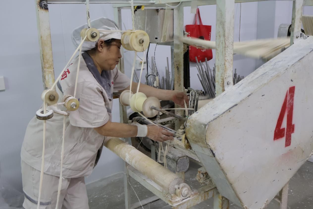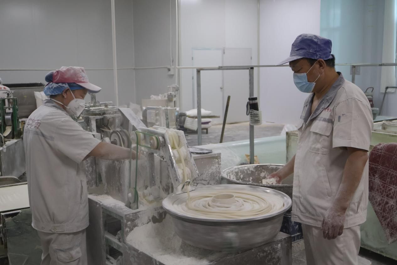 为了保护和传承这一传统技艺,龙宫宫面的制造者们开始了创新之旅。“三宫”生花队随负责人来到了生产车间,工人们身着统一的工作服,手法熟练地操作着各种传统工具和现代化设备。车间引入了现代生产设备,将部分工序自动化,提高了生产效率,同时也保证了产品的质量和口感。