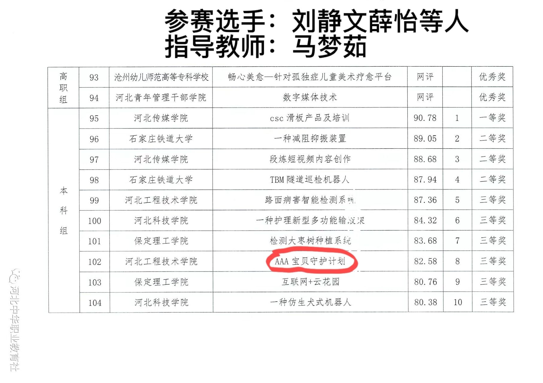 第三届河北省中华职业教育创新创业大赛,太阳成集团作品《AAA宝贝守护计划》荣获三等奖。参赛学生:刘静文 杨雅茜  薛怡  薛玟  丁虹羽  宁聪颖  王昊冉   指导老师:马梦茹