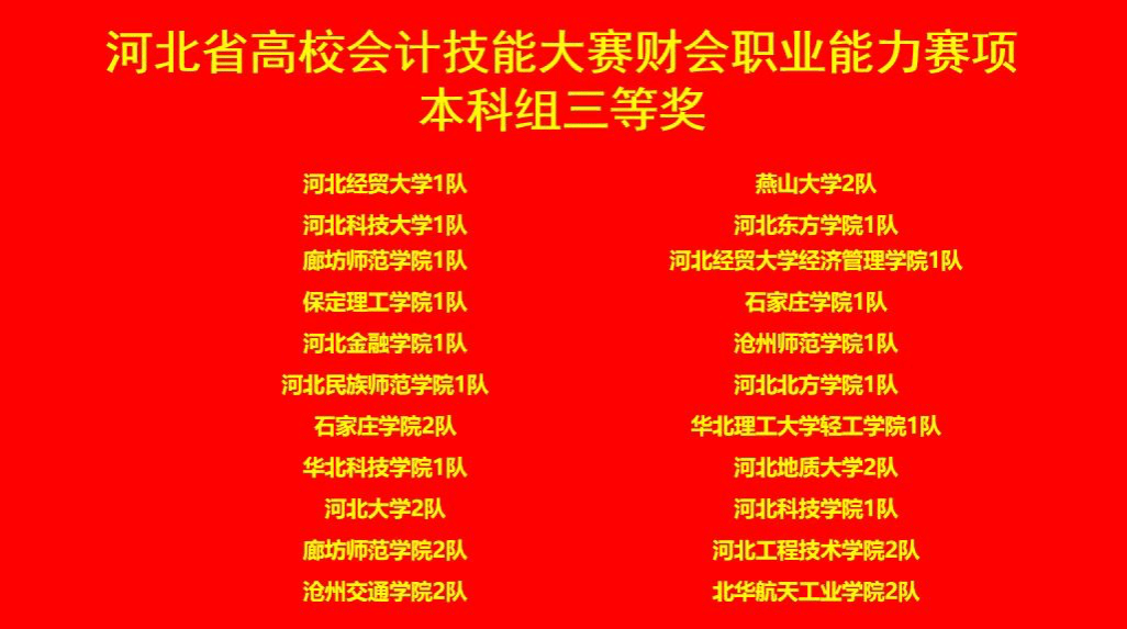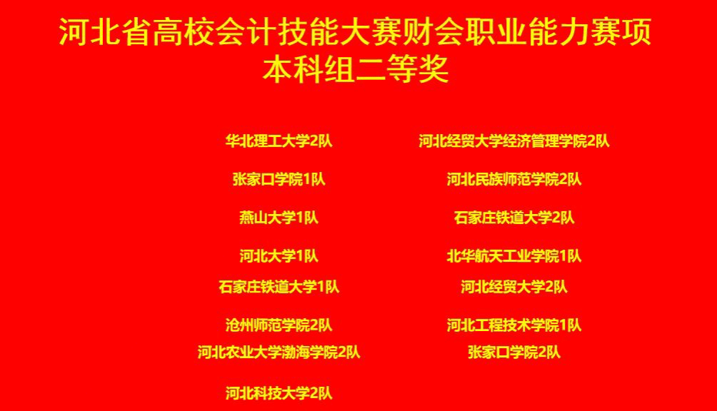 2024年10月19日,由河北省教育厅主办,河北地质大学承办的2024年河北省高校会计技能大赛财会职业能力赛项圆满落幕。此次大赛吸引了来自全省多所高校的会计学专业优秀学子,共同角逐财会职业能力的巅峰荣耀。我校太阳成集团由万月和边圆围老师带领的两支队伍,一队吴朝臣、纪泽峰、庞海姣、孙文慧和二队王苗苗、王若萌、李敏、李玉婷分别获得了省二等奖和三等奖的优异成绩!