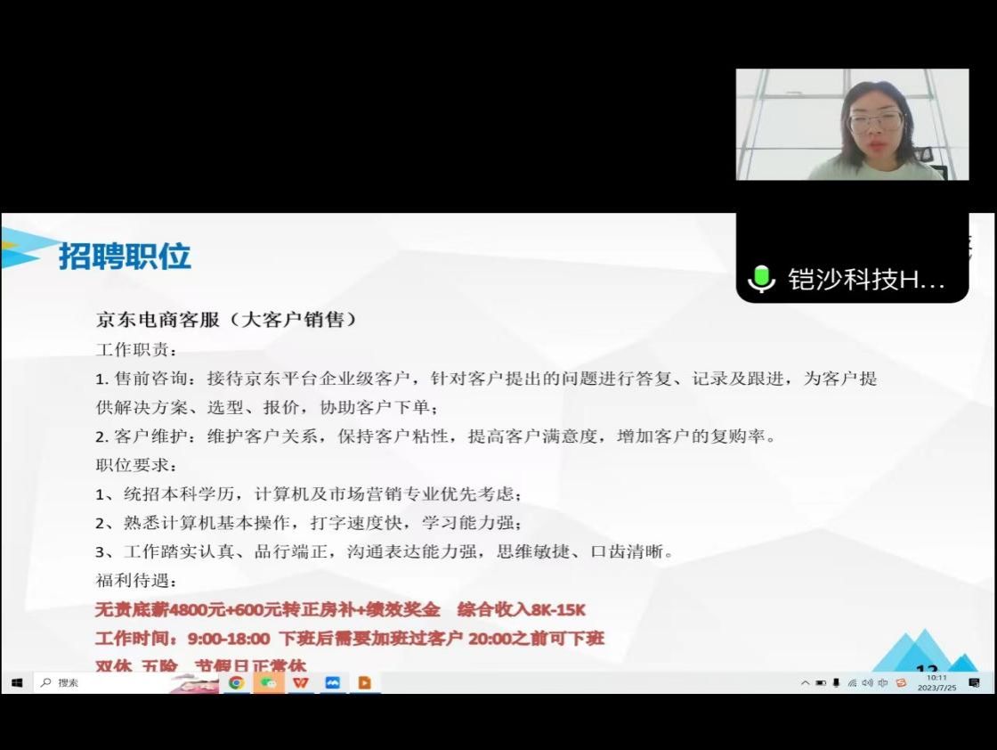 10点会议开始,首先是“铠沙科技有限公司”人力资源经理马微艳向同学们介绍了公司的基本情况,包括公司的组织机构、企业文化、业务范围、薪资待遇、职业发展等,与同学们进行岗位招聘问题沟通。