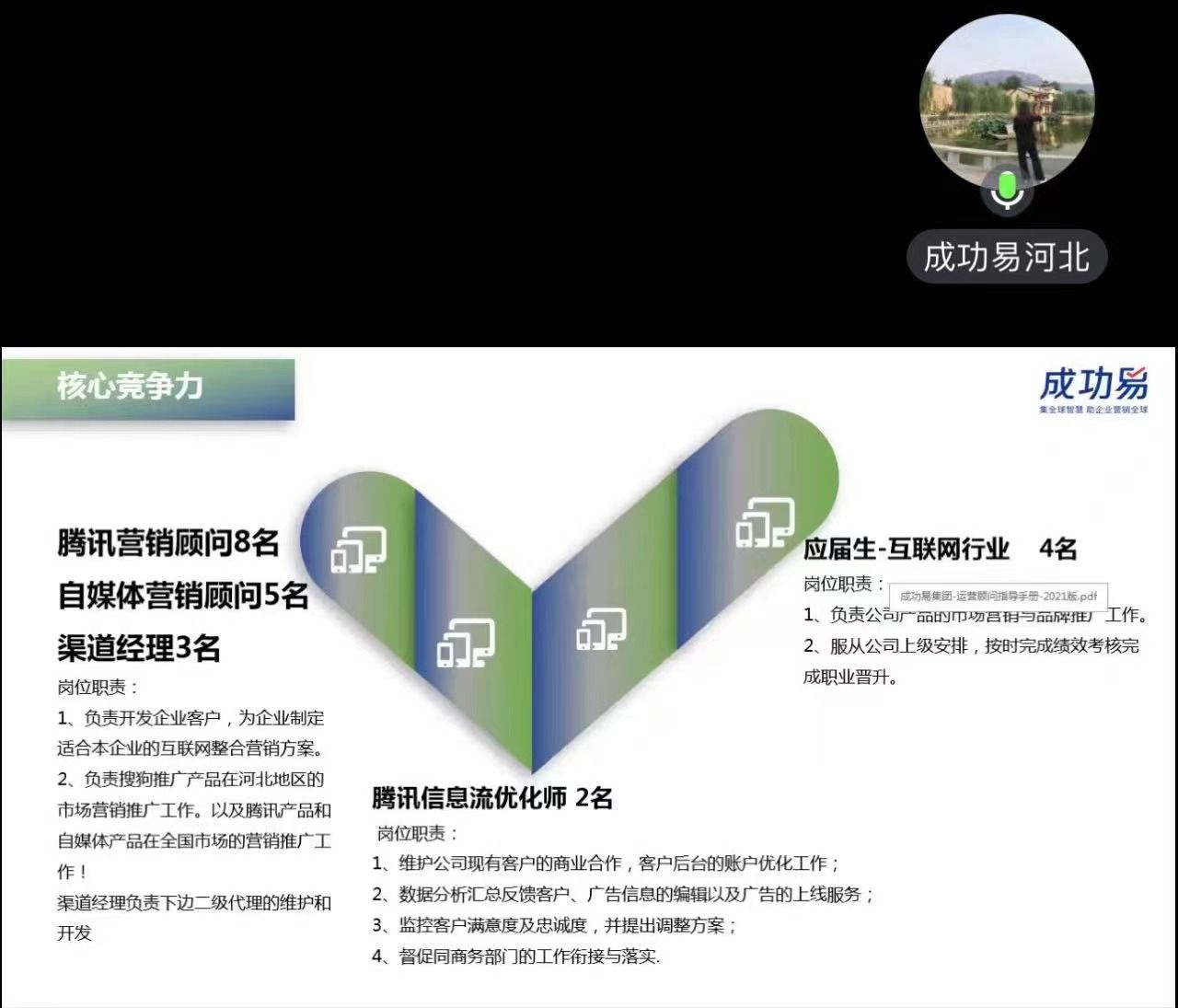 第二个企业是“成功易信息科技有限公司”由人力资源经理武彩娜向大家介绍岗位招聘的具体要求,岗位类别、岗位薪资等问题,武女士讲到希望大家的加入。