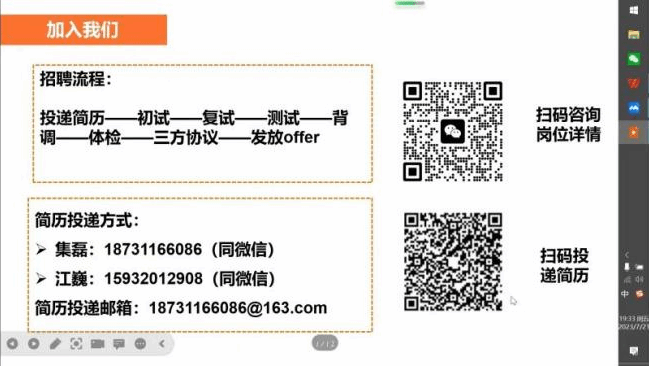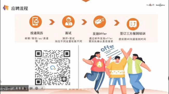 其次是珍岛信息技术股份有限公司负责人就公司简介、公司规模、现有产业结构,组织构架,人力资源政策、福利待遇等几个方面进行宣讲。珍岛集团作为行业引领性数字化转型服务商,已累积服务10万+大中小各类企业,覆盖汽车、金融、企服、零售、电子商贸、生产制造、生活、医疗大健康等领域。本次招聘主要面向23届全日制应届生,专业不限,市场营销、电子商务、计算机类优先。基本薪资5000 (4000底薪+1000绩效) +提成。