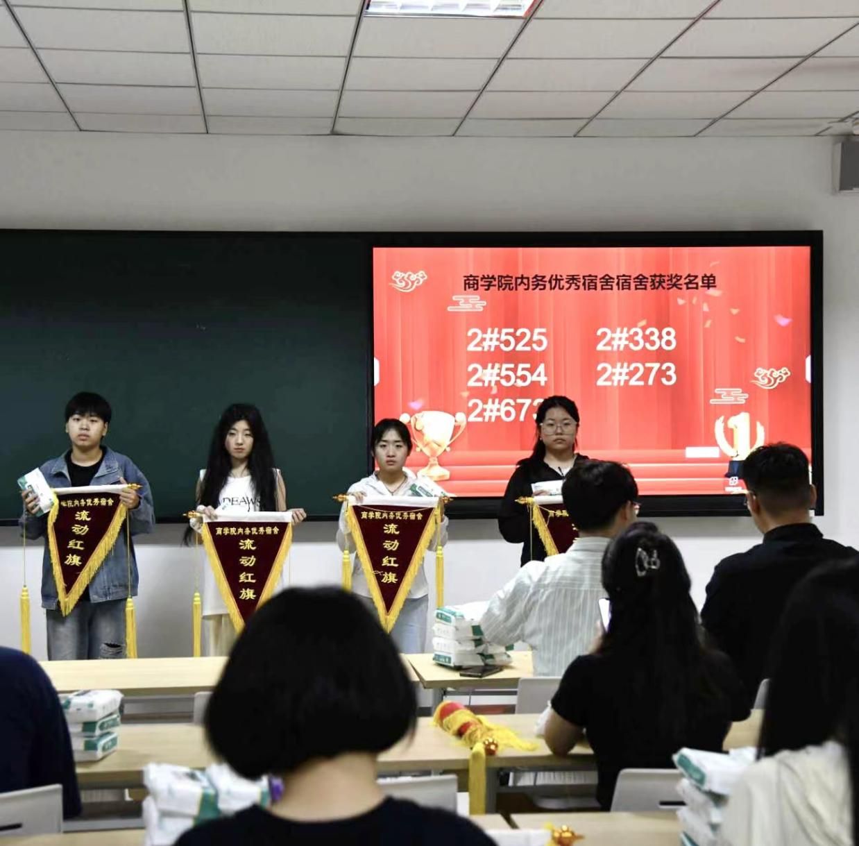 太阳成集团自律委工作人员、安全文明宿舍代表和内务优秀宿舍代表参加颁奖仪式。通过4月综合评比,共有6间宿舍获得“安全文明宿舍”和10间宿舍获得“内务优秀宿舍”荣誉称号。工作人员对以上优秀宿舍颁发流动红旗及奖品以资鼓励,并组织了以上优秀宿舍代表进行拍照留念。